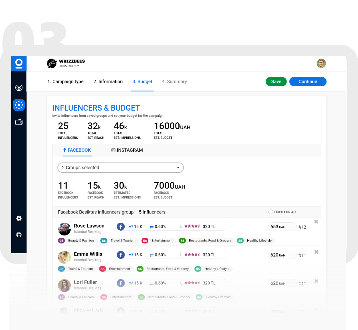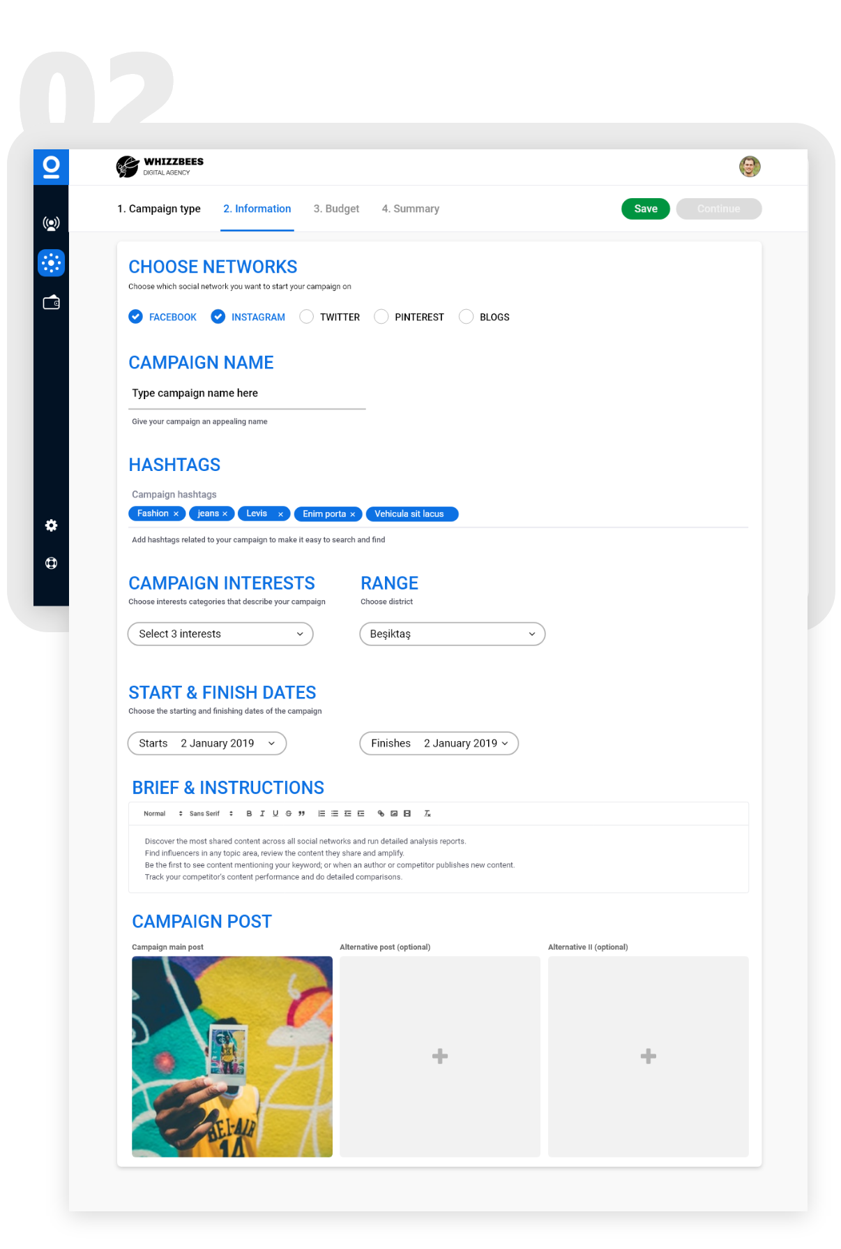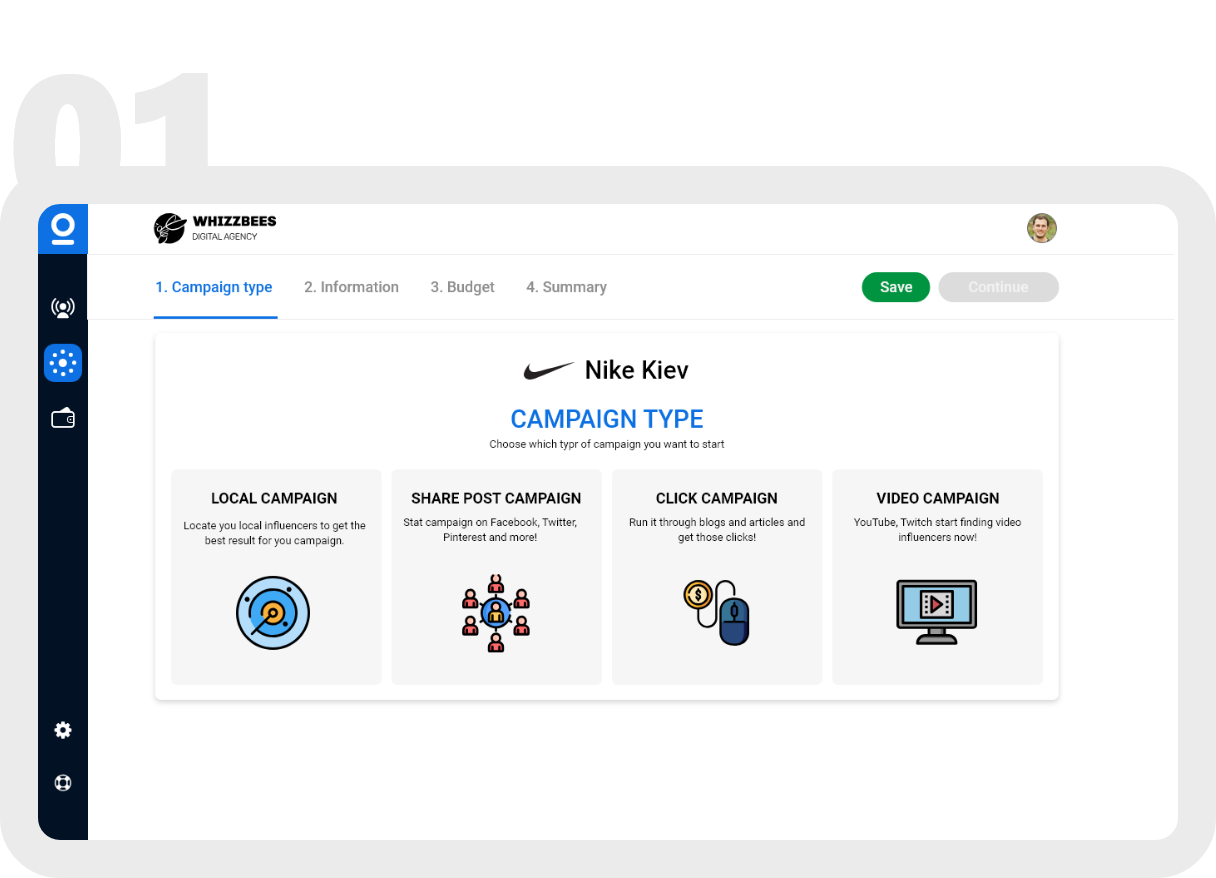 Clients choose social media channels for their campaign, give instructions to influencers. Setting campaign budget